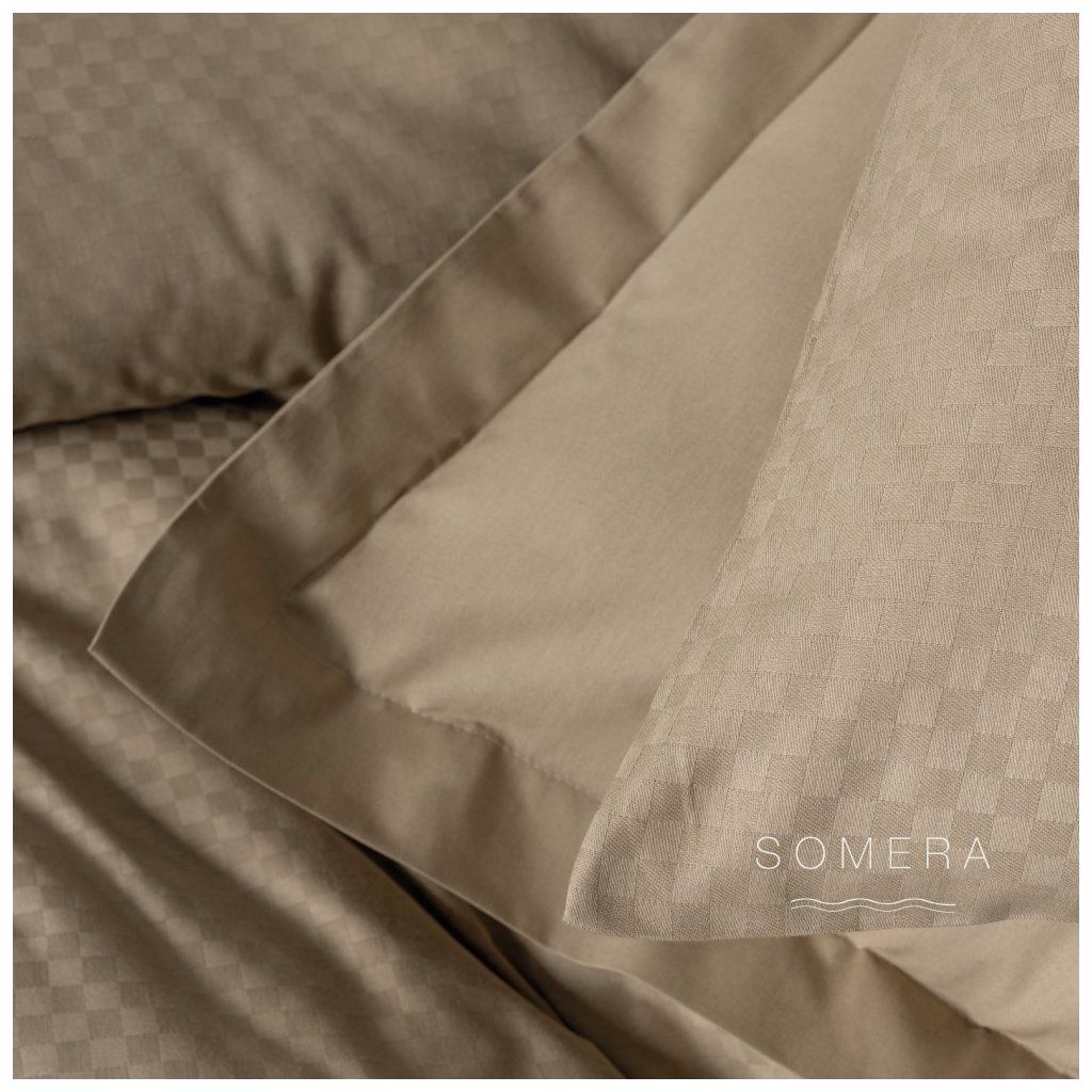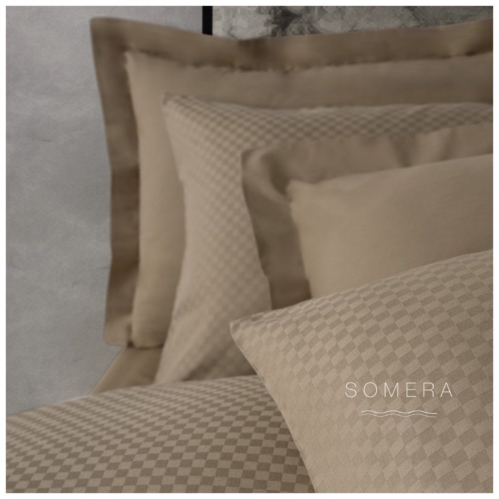 Vzor na týchto obliečkach nie je potlačený, je tkaný priamo do štruktúry látky. Ide o jemný geometrický reliéf z malých kosoštvorcov, ktorý je viditeľný len pri zmene uhla svetla. Efekt je subtílny: obliečky nevyzerajú jednoducho ani výrazne vzorovo, niečo medzi tým. Na posteli pôsobia uhladene a premyslene.